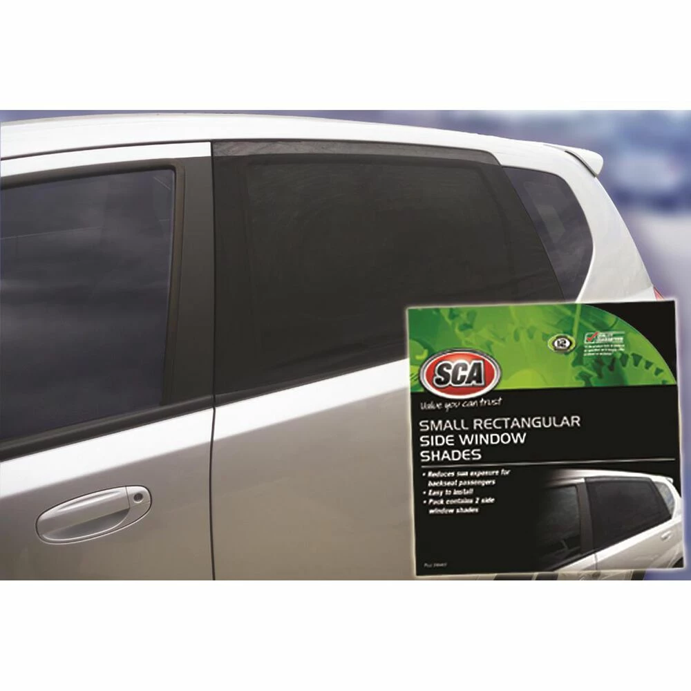 Durable and easy to fit on a wide variety of cars, these Small SCA Side Window Shades are ideal for passenger comfort while driving. Sold in pairs, these shades increase protection from bright UV rays and assist in keeping the interior of the vehicle cool. The rectangular shape provides a great fit for vehicles such as SUV’s and Station Wagons with rectangular shaped rear windows. These shades also provide some privacy for passengers and aren’t permanent like installed tinting. These sun shades are very easy to install on your vehicles rear windows. They simply slide over the door frame and attach to the door using adhesive hook and loop strips, making them easily removable. This makes them a great temporary or permanent solution for someone undecided or against the installation of window tint on their vehicle.